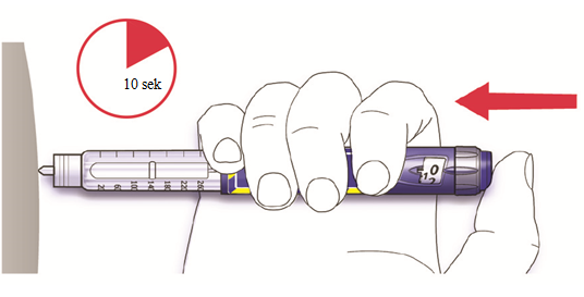 D. Håll injektionsknappen intryckt hela vägen in. Räkna sedan sakta till 10 innan nålen dras ut från huden. Detta säkerställer att hela insulindosen ges.