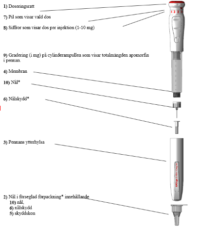 (r) Om det inte finns tillräckligt med apomorfin i ampullen för en ny injektion, gör du i ordning en ny penna.