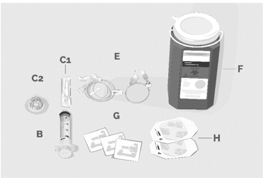 A. Infusionspump med sprutsystem och tillverkarens bruksanvisning (visas inte) B. Kompatibel spruta C1. Överföringsnål ELLER C2. Nål-lös överföringsenhet för att dra upp läkemedel ur injektionsflaskan D. Infusionsset (visas inte, varierar beroende på tillverkarens anvisningar för utrustningen) E. Infusionsslang och Y‑anslutning (om sådan krävs) F. Behållare för vassa och skärande föremål G. Alkoholservetter H.Gasbinda och tejp eller transparent förband |