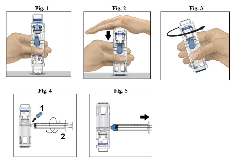 - Placera injektionsflaskan med pulver på en plan yta med injektionsflaskan med lösningsvätska överst (Fig. 1). Injektionsflaskan med lösningsvätska har en blå rand. Ta inte av det blå locket förrän du uppmanas att göra det i ett senare steg.