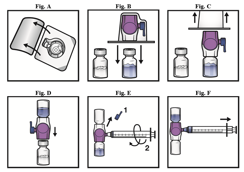 - Vänd på systemet så att flaskan med lösningsvätska hamnar överst. För snabbt in den lila plastspetsen helt genom proppen på injektionsflaskan med pulver genom att trycka rakt ned (Fig. D). Vakuumet drar in lösningsvätskan i injektionsflaskan med pulver.